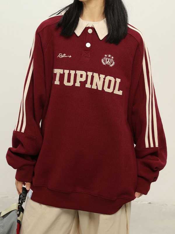 Letter Embroidered Piping Lapel Neck Sweatshirt