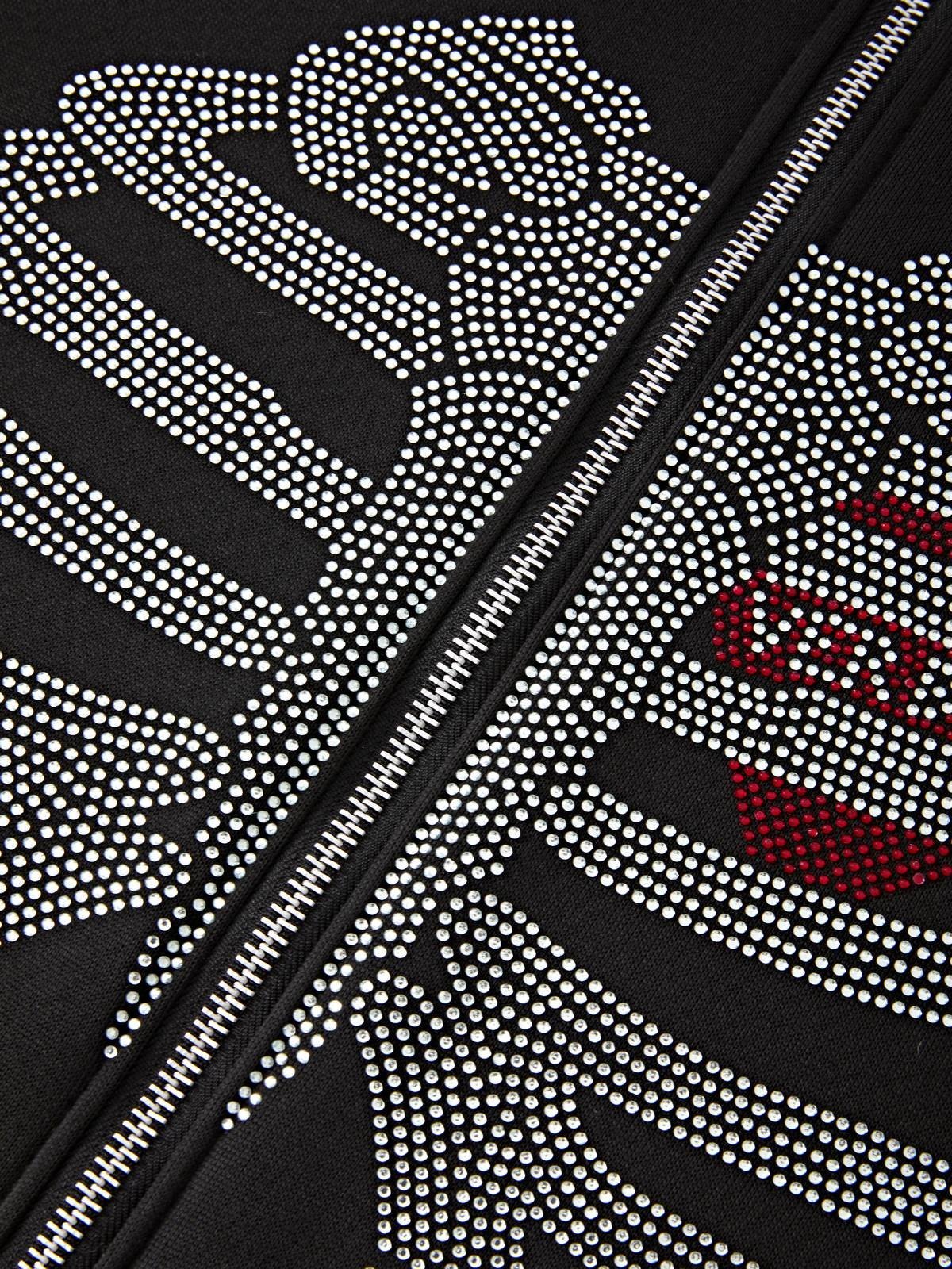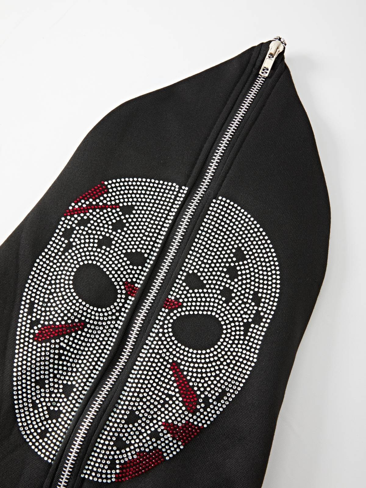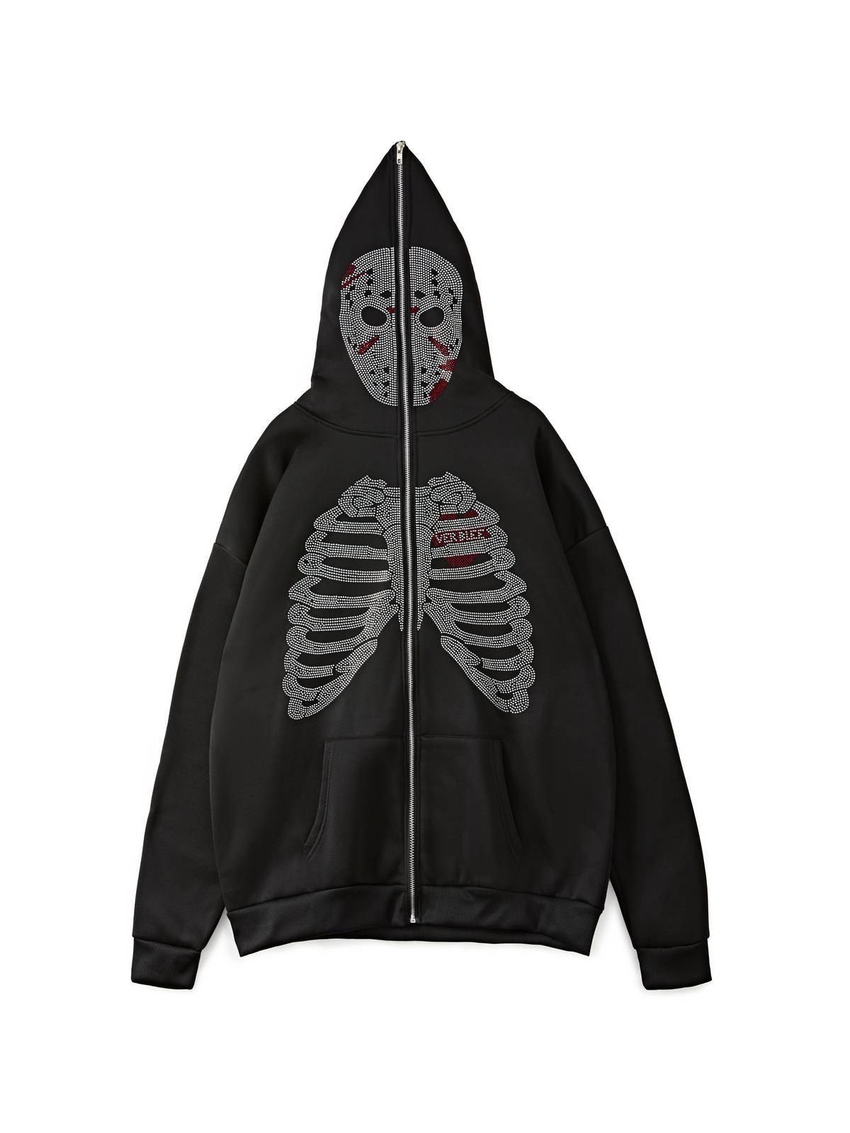 Description: Updated with these hoodies for Halloween festive-vibes. Cutting to a relax silhouette, features rhinestone skull face and skeleton bones pattern to the front, with functional pockets, drop shoulders, and a zip fasten design.