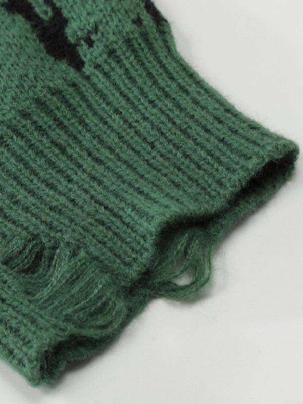 Description: Features a design of dark pattern jacquard allover, these cosy punk-vibe jumpers cut to a relax silhouette, made from acrylic knit fabric, with dropped long sleeves, and frayed rip holes design.