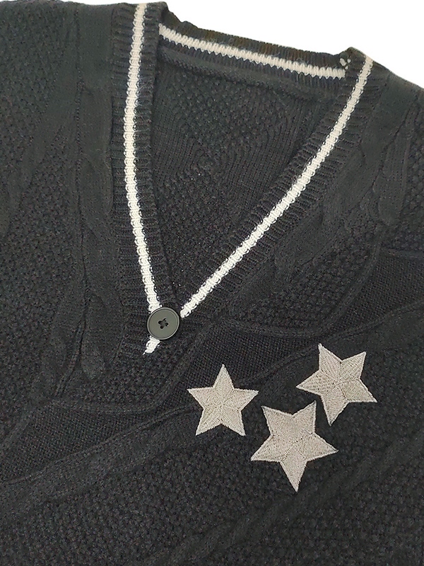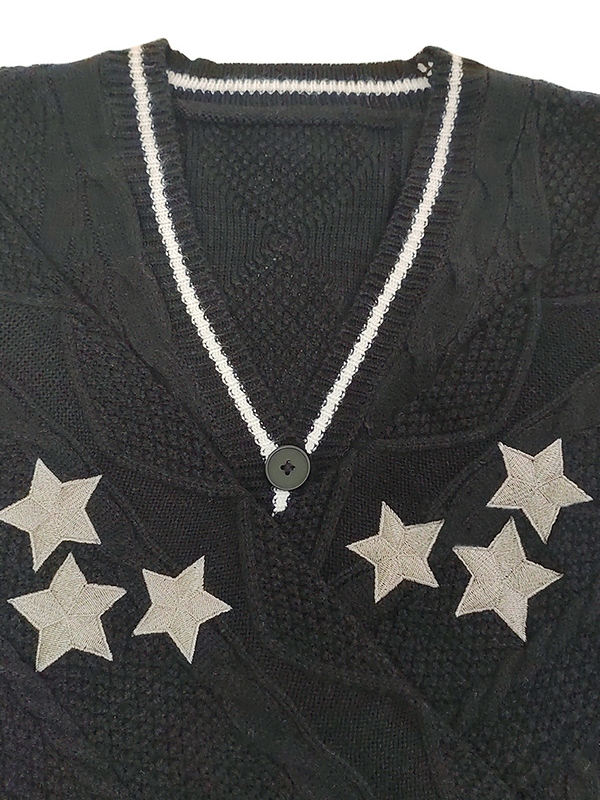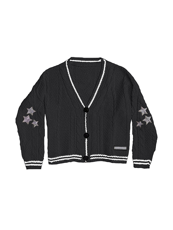 Description: Star things may add some fun to your winter outfits. These cosy knitwears cut to a super flattering silhouette, features star embroidered, contrast striped detail and drop shoulders design, ended with button fasten to the front.