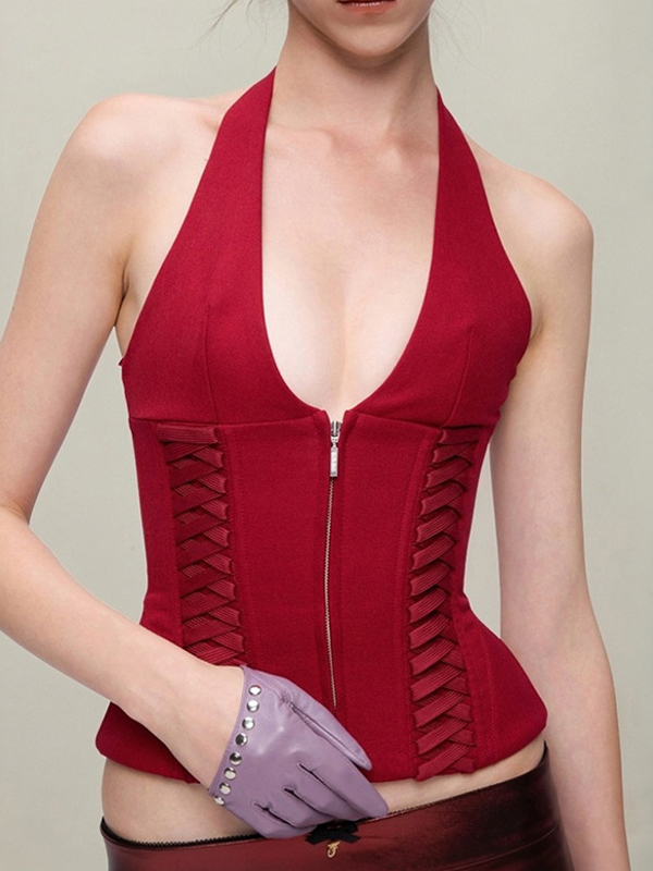 Busty V-Neck Reveals Collarbone Halter Vest